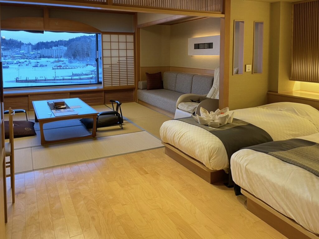 大きな窓から凍った阿寒湖を望むことができる、広々とした和洋室を選びました。