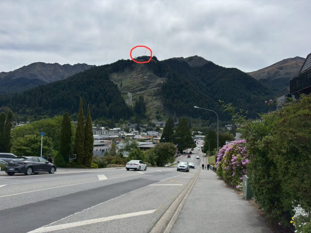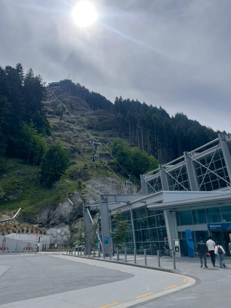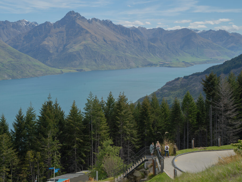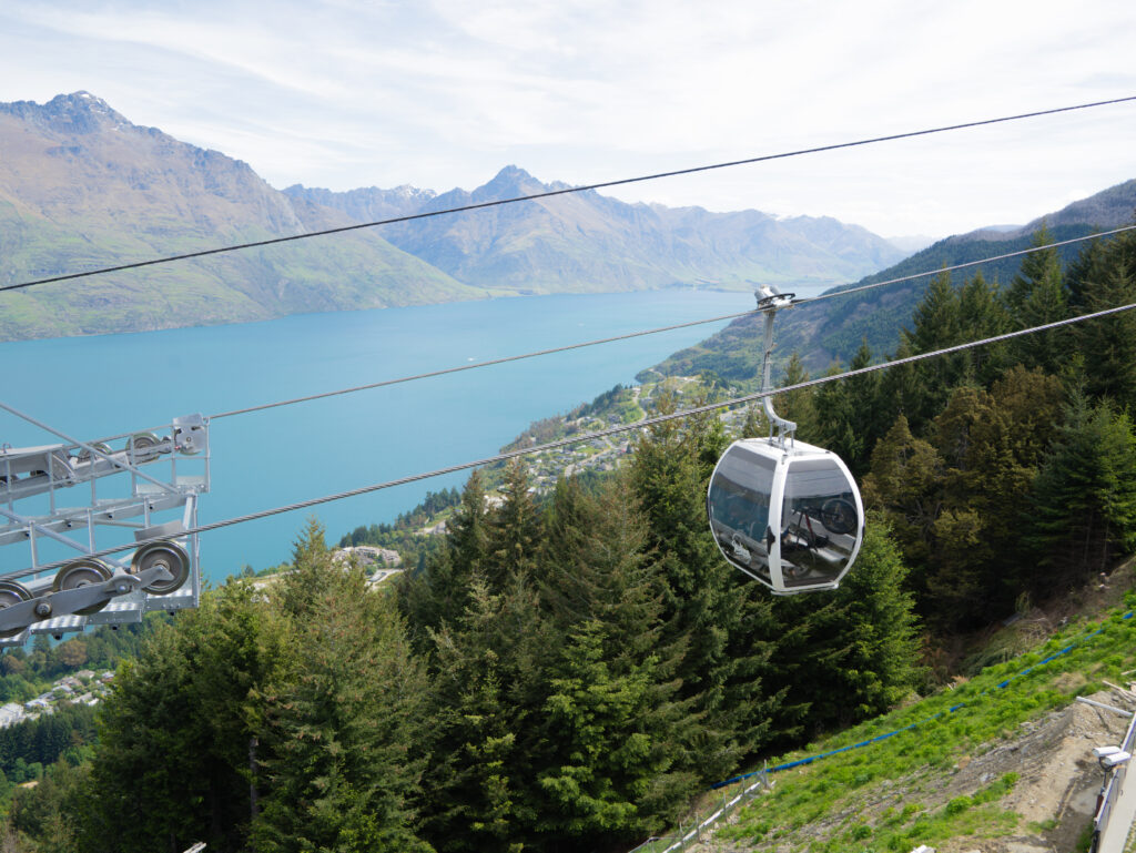 スカイゴンドラに乗って約10分、あっという間に山頂の展望台へ。眼下にはエメラルドブルーのワカティプ湖と、雄々しいリマーカブルズ山脈の絶景が広がります。