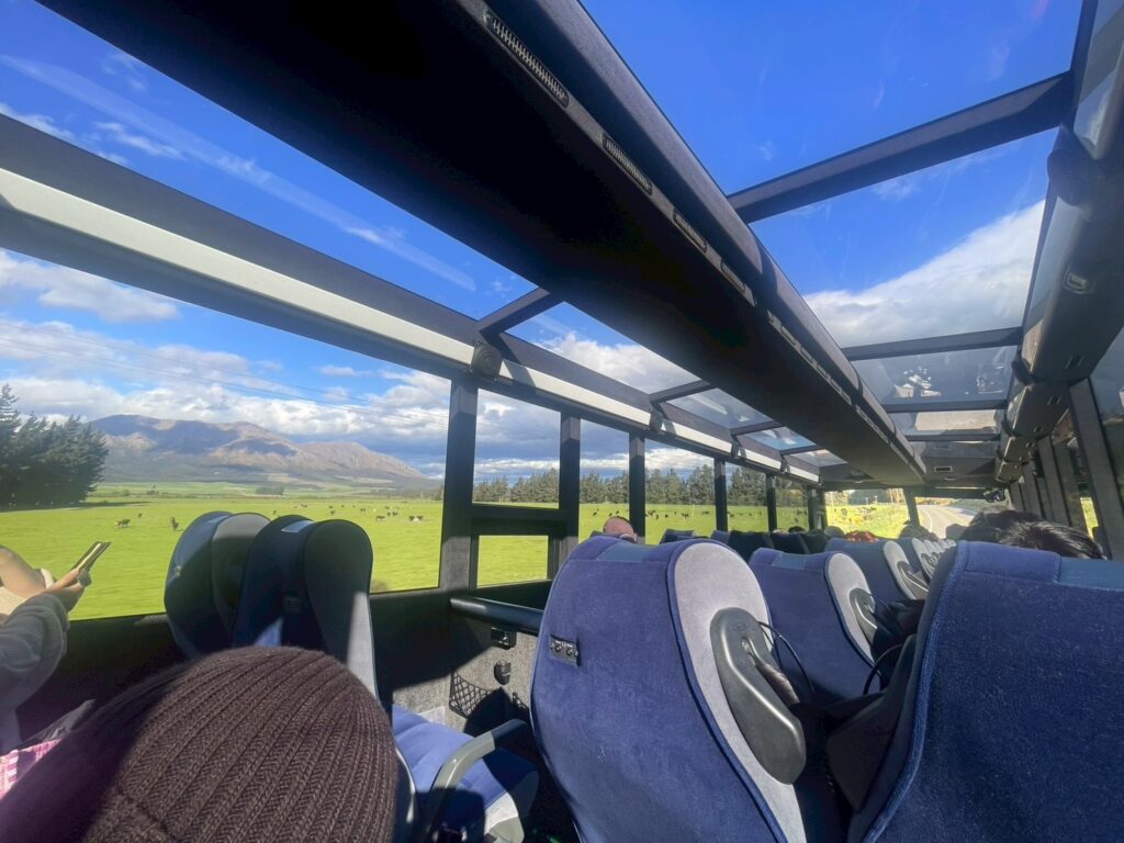 日本では見ないくらい大型の観光バスには大きな天窓もあり、車窓がすでに絶景!4時間の道のりなのですが、景色を楽しんだり寝たり。途中2回ほどトイレ休憩を挟みながらあっという間につきました。