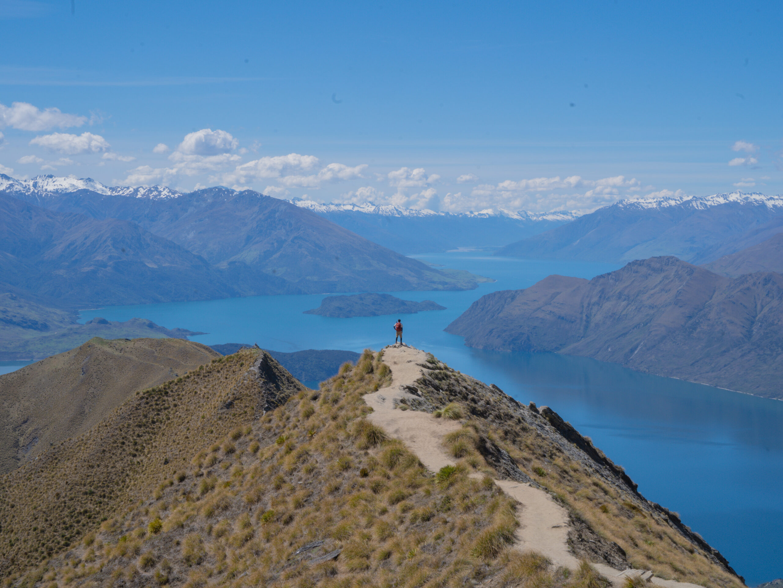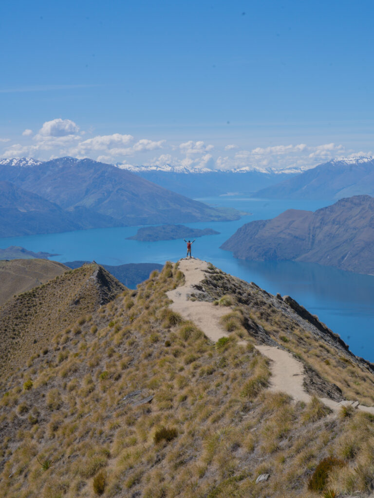 細長く伸びた尾根の上からは、ワナカ湖の入り組んだ湾や半島、遠くにそびえる雪をかぶった山々、そして空へ伸びる稜線まですべてが一望でき、写真で見たことのある“ロイズピークの景色”が、目の前に広がっていました。