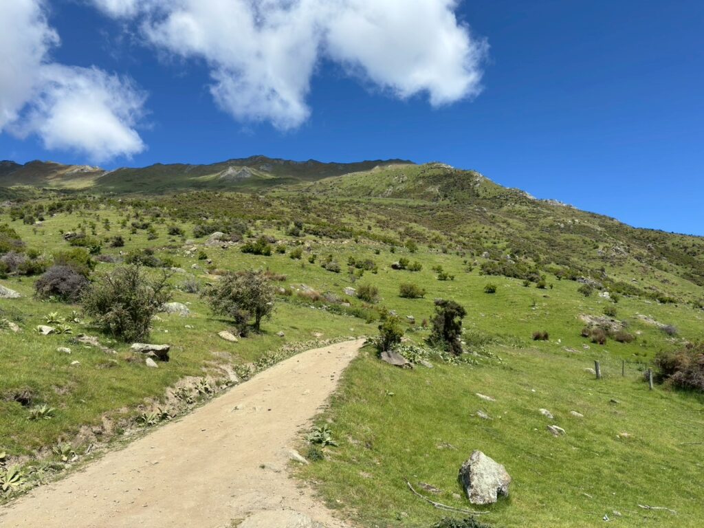 最初のうちは広めの道で、羊や牛もいる牧草地を通ります。足元には乾いた土と短い草。あとはあちらこちらに糞が落ちています。​その靴のままホテルに向かうとホテルの部屋にうっすら牧場臭が漂うので、どこかで水で流せると良いですね。