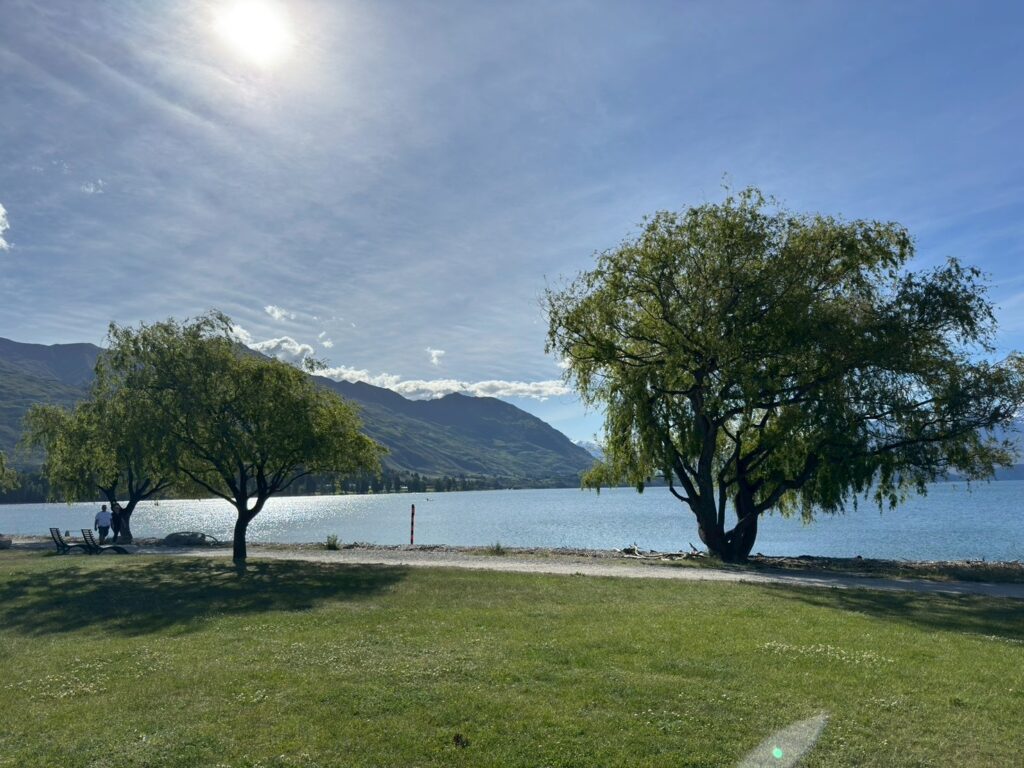 ワナカの町に着くと、まず目に飛び込んでくるのは、広いワナカ湖と、その向こうに続く山々のシルエット。